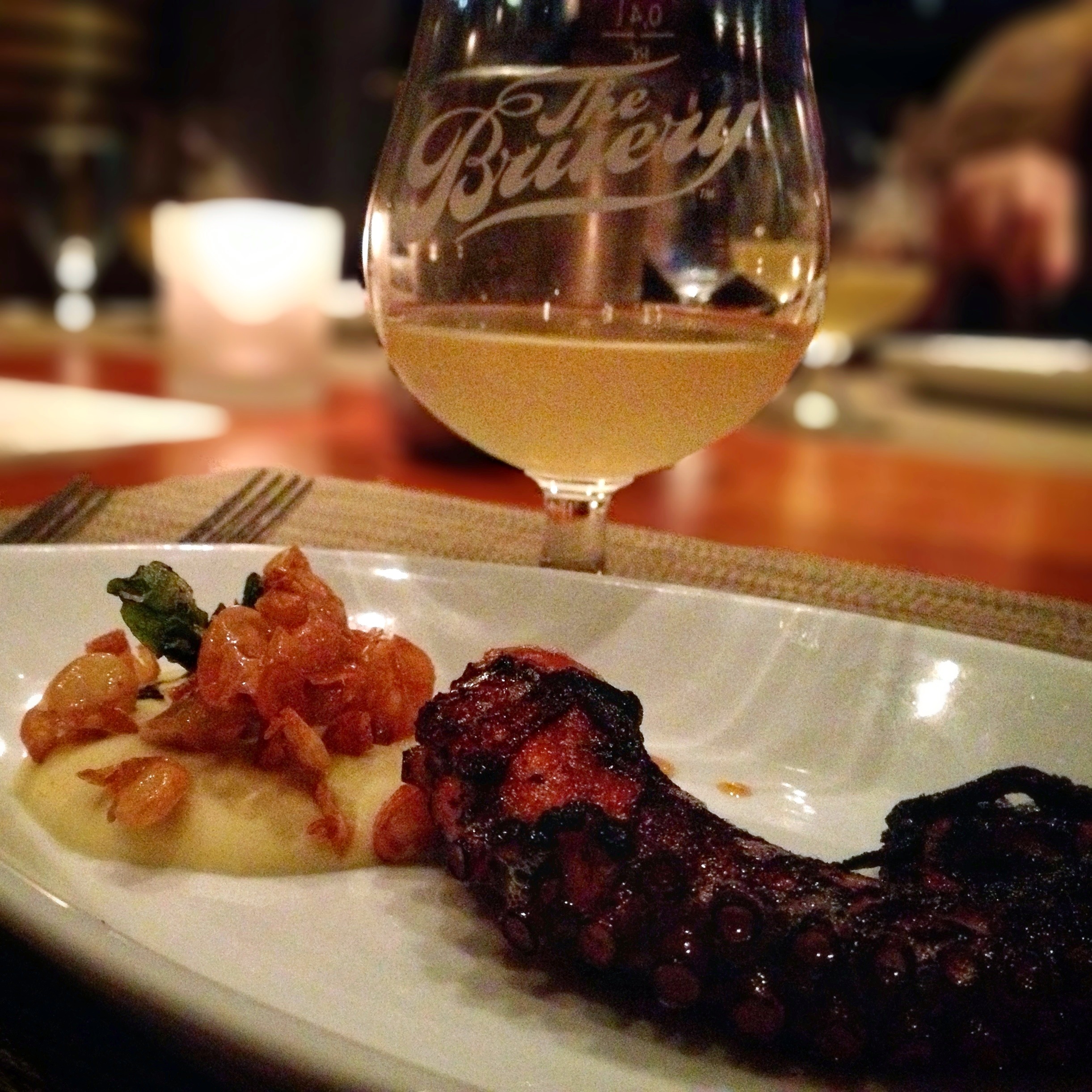 Breakfast is my favorite meal, and I’m one of those people who can eat it any time of the day or night. Pancakes for dinner? Always a good idea. So, I was thrilled to see a breakfast-inspired course on the menu. And not only did it not disappoint, it may have ruined me for all other breakfast sandwiches forever. Which is saying a lot, because I’m a New Yorker. But before I delve into the flaky goodness of this not-just-for-mornings masterpiece, let me tell you why these crafty chefs decided to serve up pork and eggs as the fourth course. Behold, the Autumn Maple, one of my favorite Fall beers for its pumpkin-esque punch of Autumn spices like cinnamon and nutmeg but did you know that it is actually brewed with 400 lbs of fresh-roasted yams? Four. Hundred. Pounds. Per 15-barrel batch. No wonder some refer to it as Sweet Potato Pie in a glass. And no wonder Chef Keenan opted to pair it with a breakfast item. The glazed pork belly with crispy skin and succulent center could not have been a better choice with the dark, sweet molasses of the brew. Add in a farm fresh egg and buttery biscuit, and you have the ultimate sweet and savory combination. Think McGriddle. To the extreme. Prepared by a top chef. I loved it so much, I asked for one to go, and they cheerfully obliged. 6 courses left, but how could they possibly top that? (Spoiler alert: They do.)